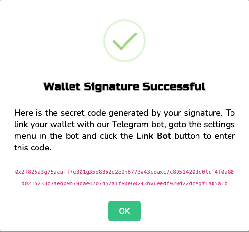 0x...) will be shown. Click the code to copy it, then paste the code into your Telegram bot.