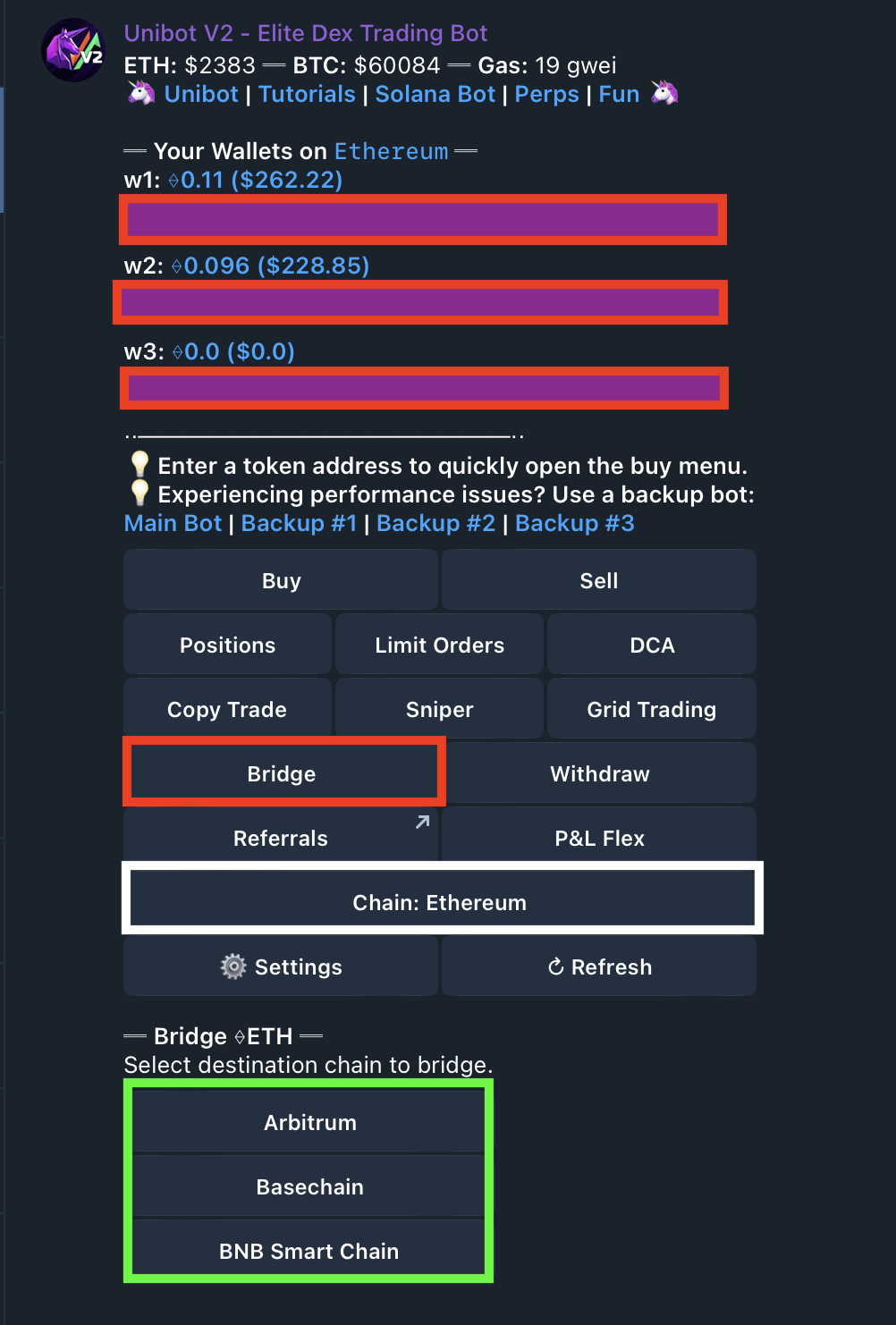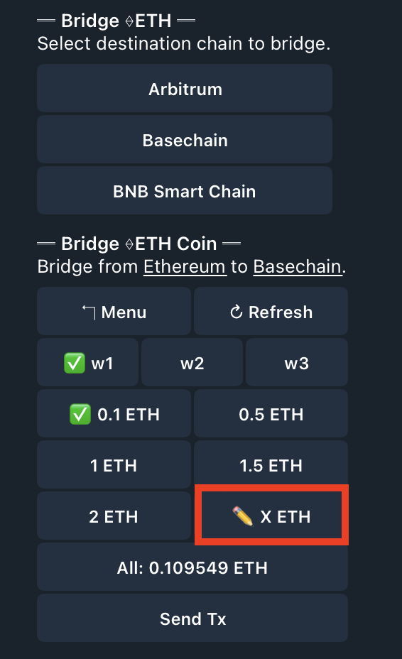Select ETH Amount - Choose either (1) preset ETH amount; (2) set a custom amount you wish to bridge by clicking the 'βοΈ X ETH' button (see the red box above) to input the desired amount in the Telegram chat bar; or (3) 'All,' which will bridge all of your tokens.