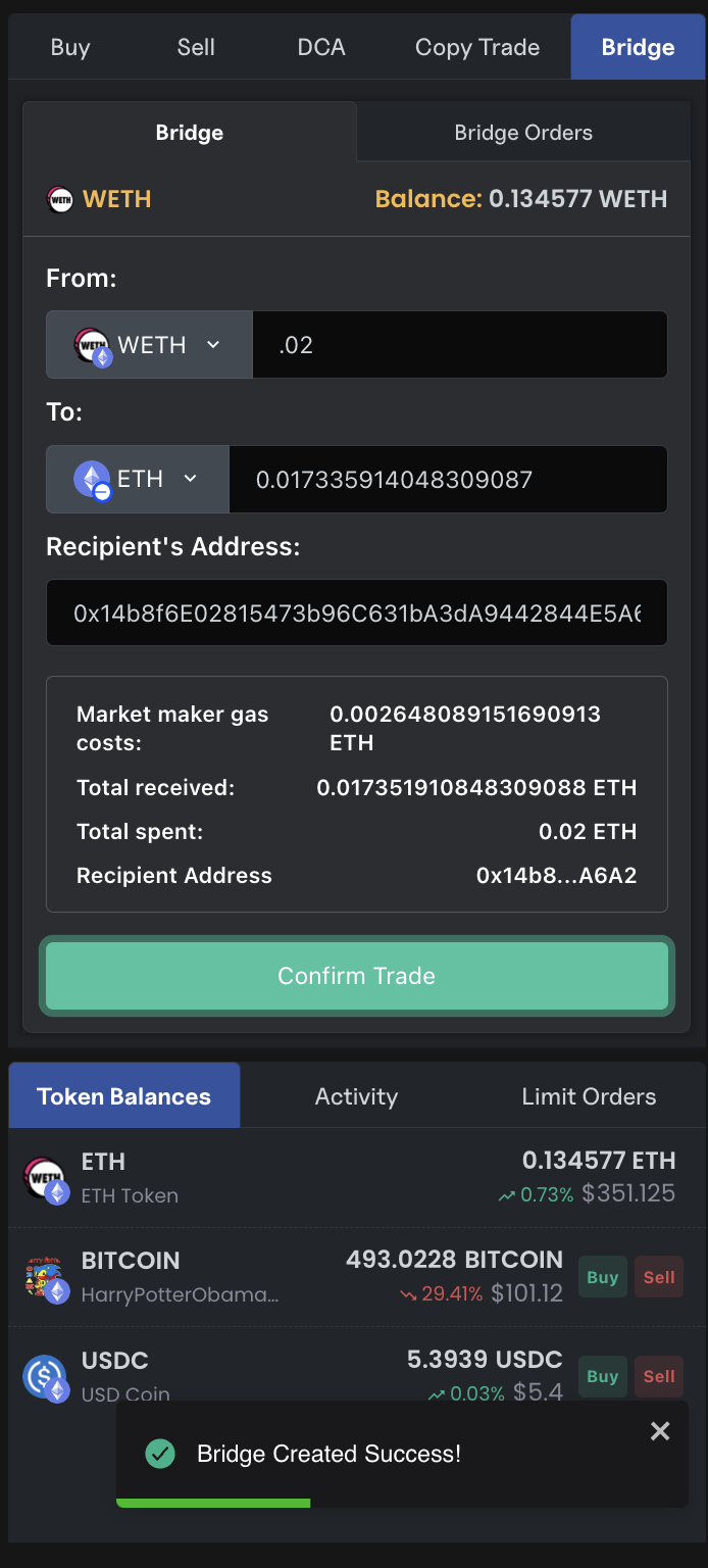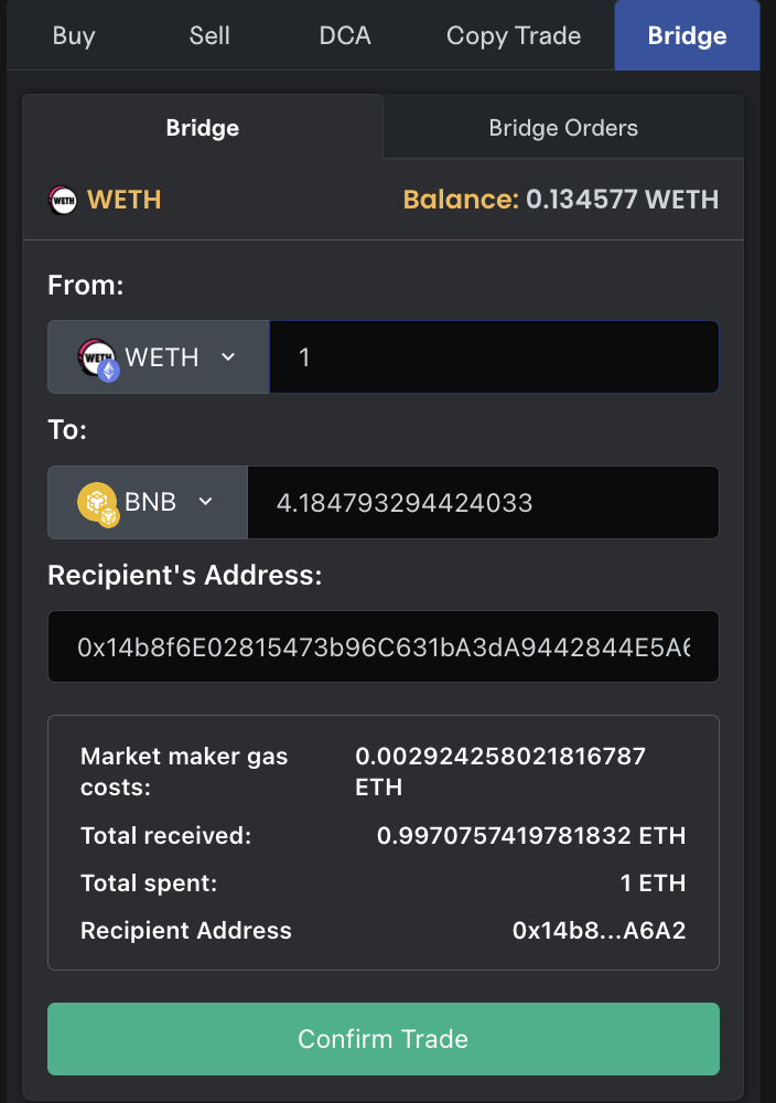 Confirm Trade - Click the 'Confirm Trade' button to begin bridging between chains.