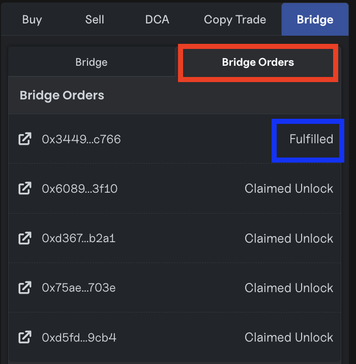 Under 'Bridge Orders,' you will see past and present bridge orders. When the order says 'Fulfilled' (see the blue box), that means the bridge is complete and the funds are on the chain and the wallet you bridged to.